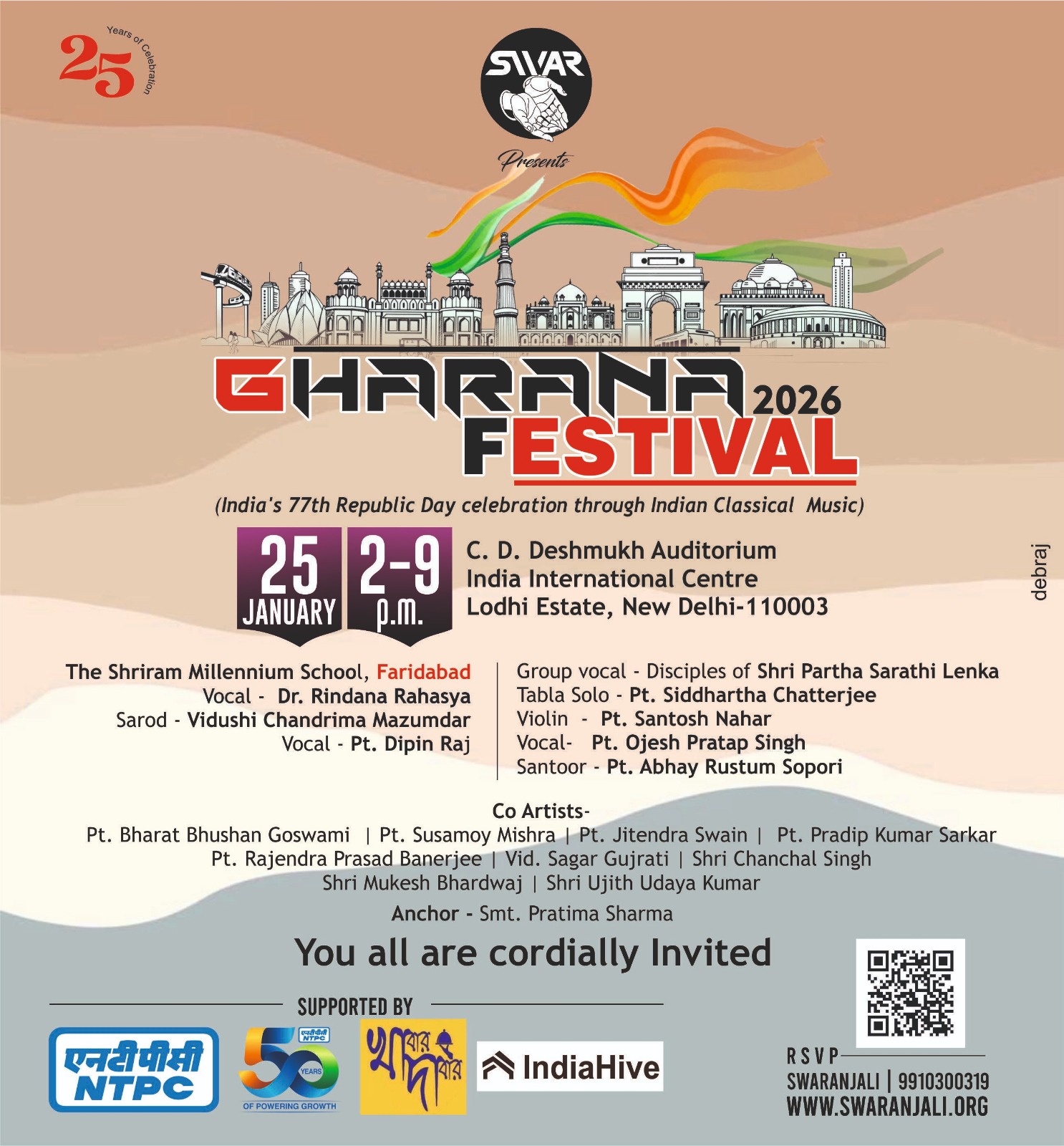 New Delhi, Jan 03: The capital is set to resonate with the timeless sounds of Indian classical music as Gharana Festival 2026 is scheduled to be presented by Swaranjali under the aegis of SIVAR, in celebration of India’s 77th Republic Day. The festival will take place on January 25 at the C. D. Deshmukh Auditorium, India International Centre, and is expected to bring together eminent artists, scholars, students, and lovers of classical music.